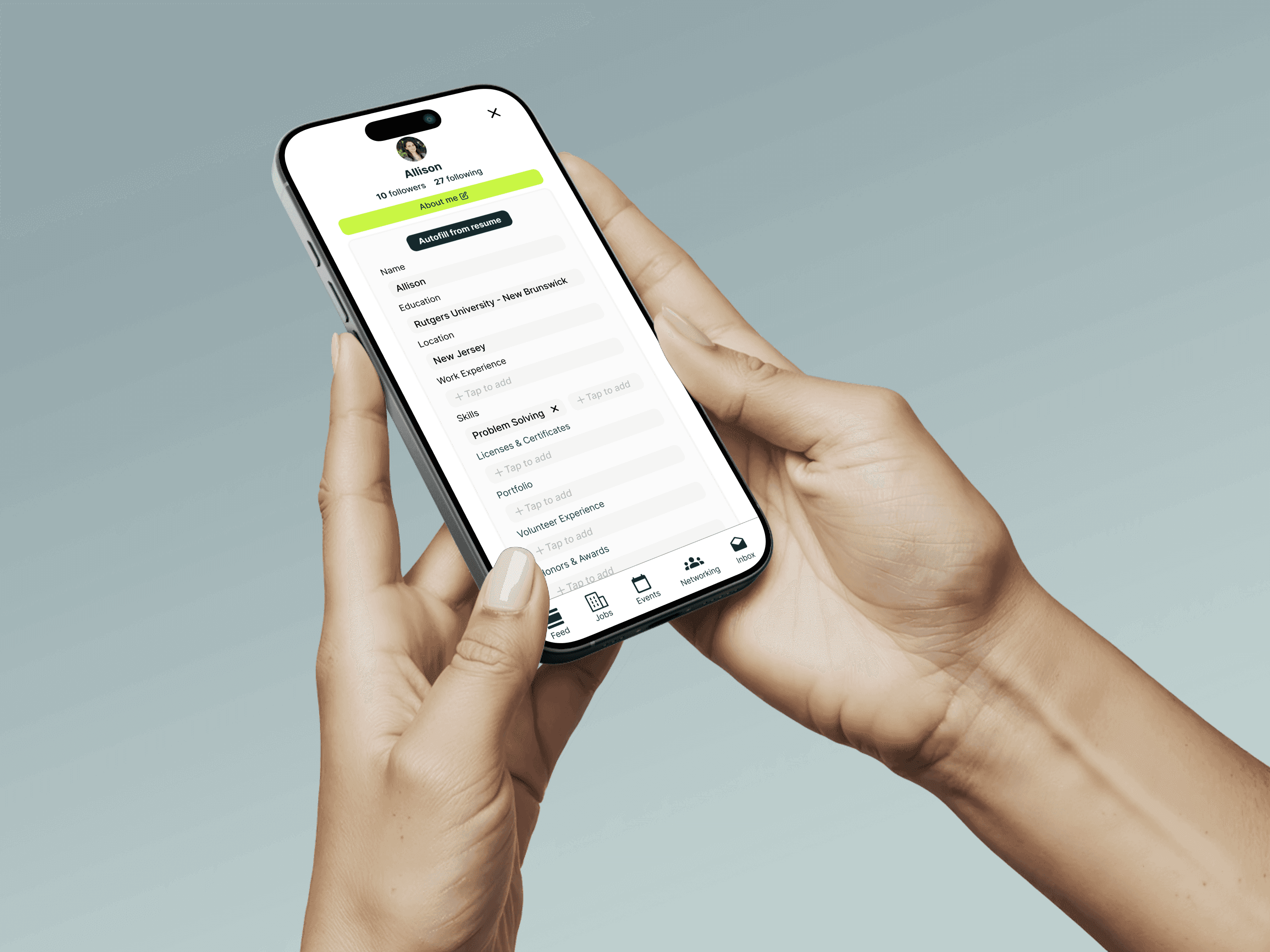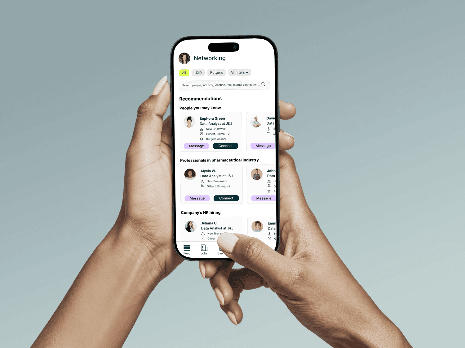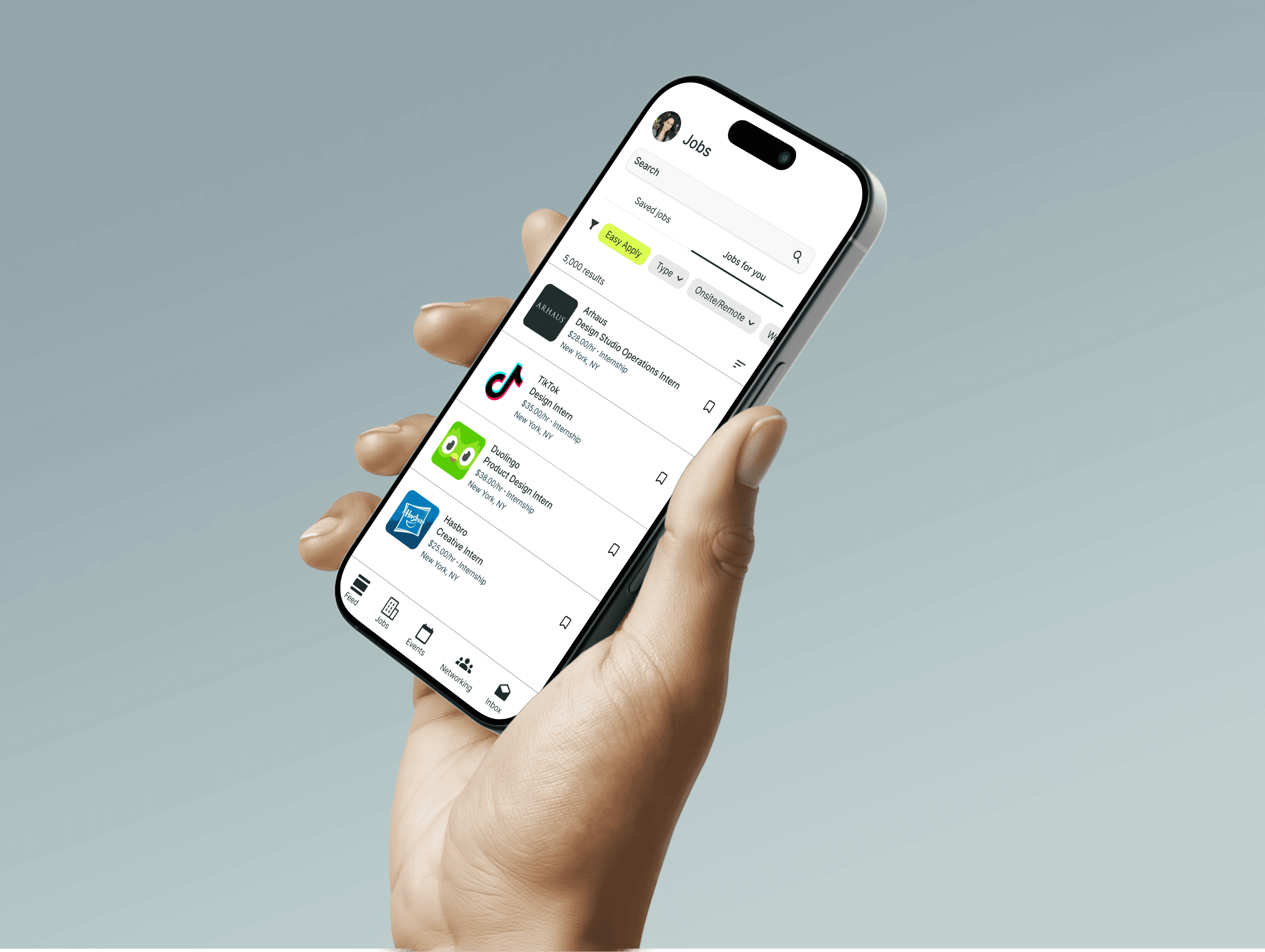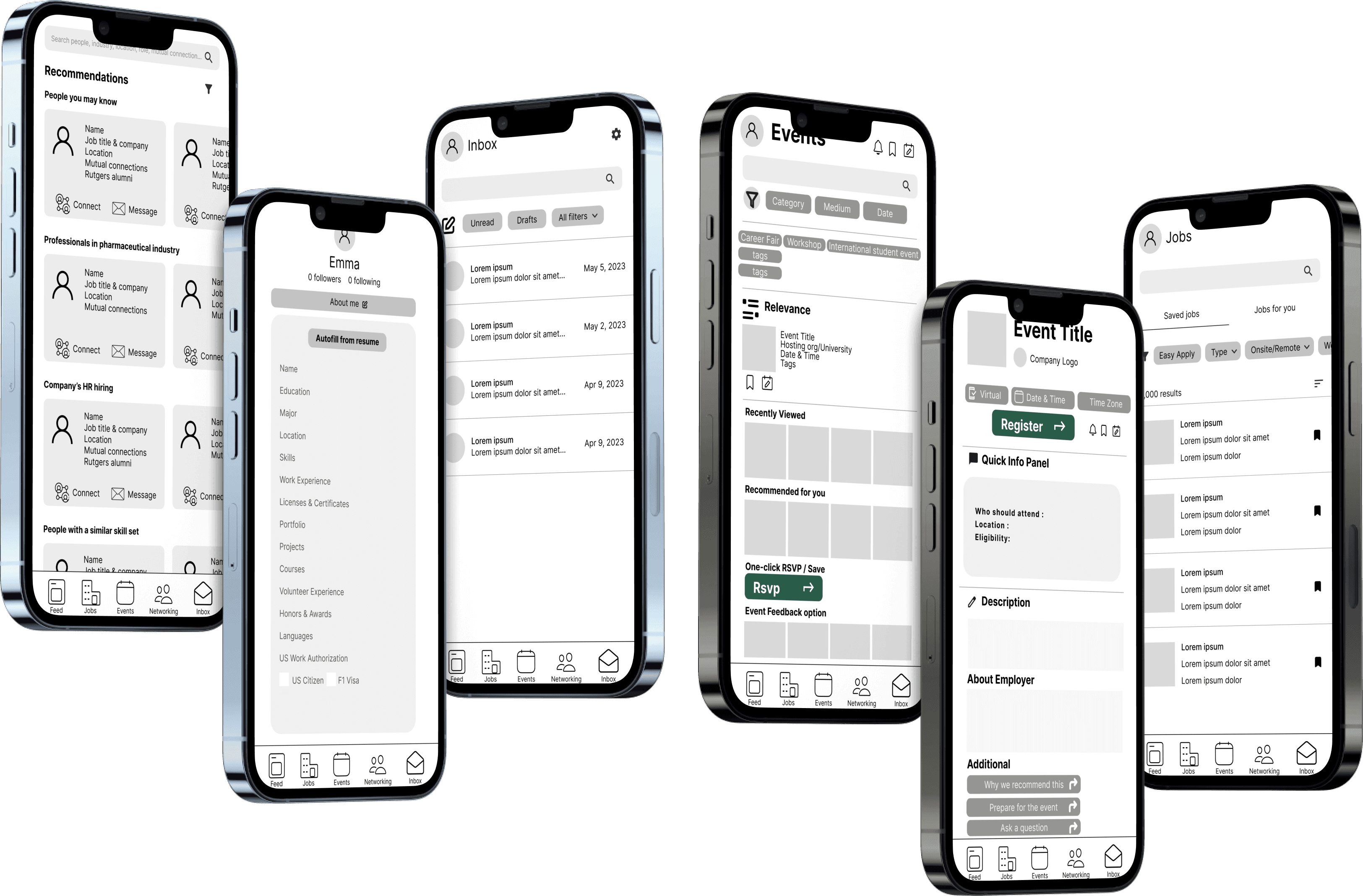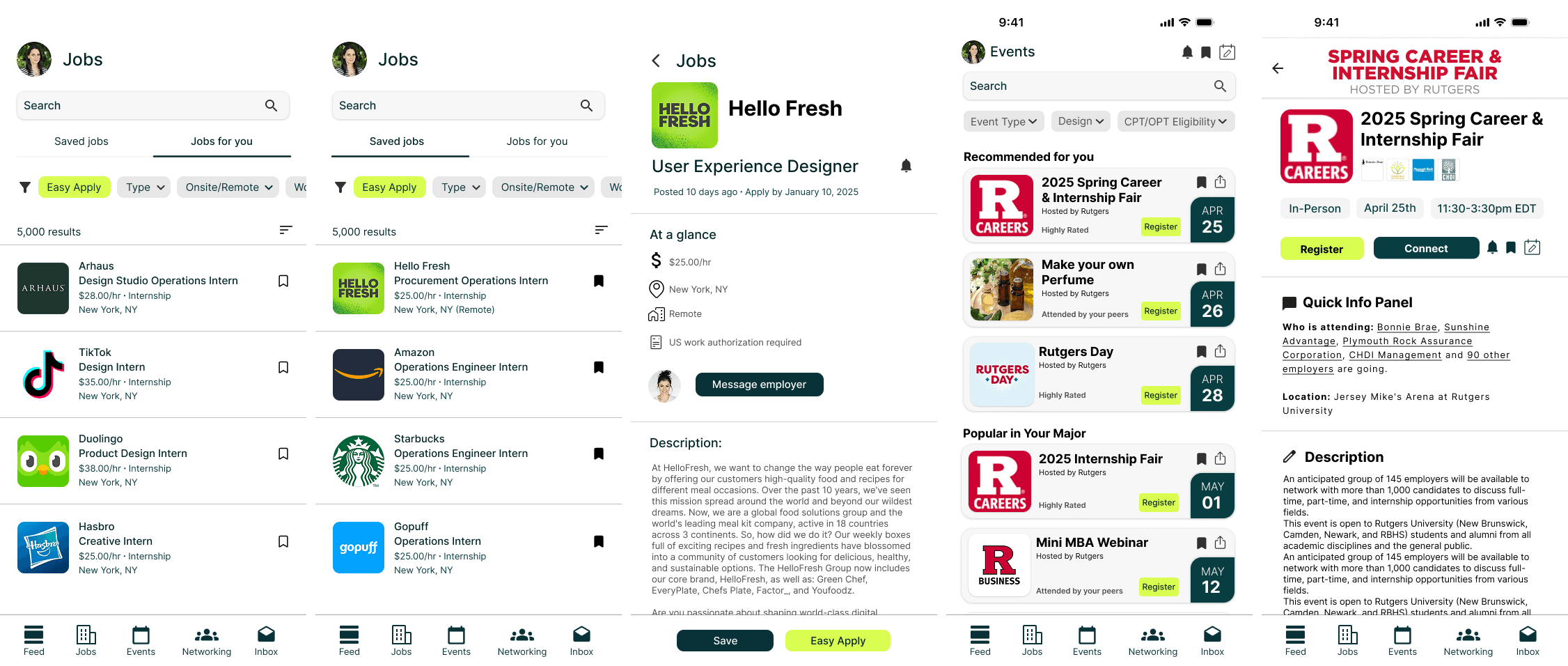We designed a mobile first MVP that organizes Handshake into four tabs: Jobs, Profile, Networking, and Events. Each tab directly responds to our research insights.