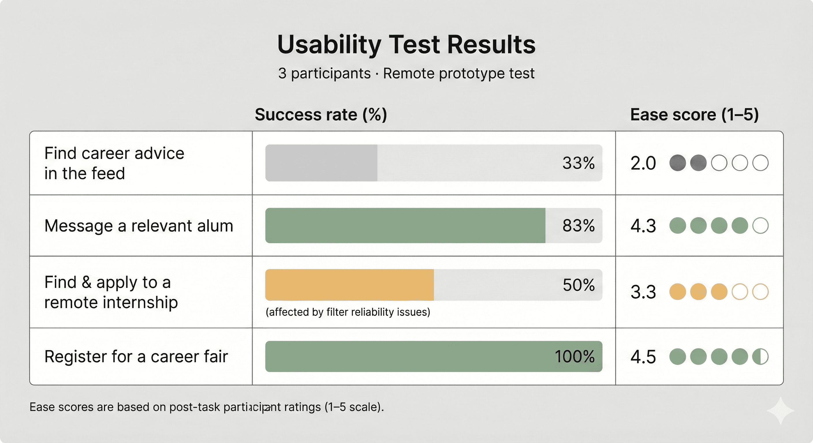 Our synthesis work made it clear that we did not just need 'nicer screens.' We needed flows and structures that respected students' time, made eligibility and status obvious, and stitched jobs, networking, and events into one coherent experience.