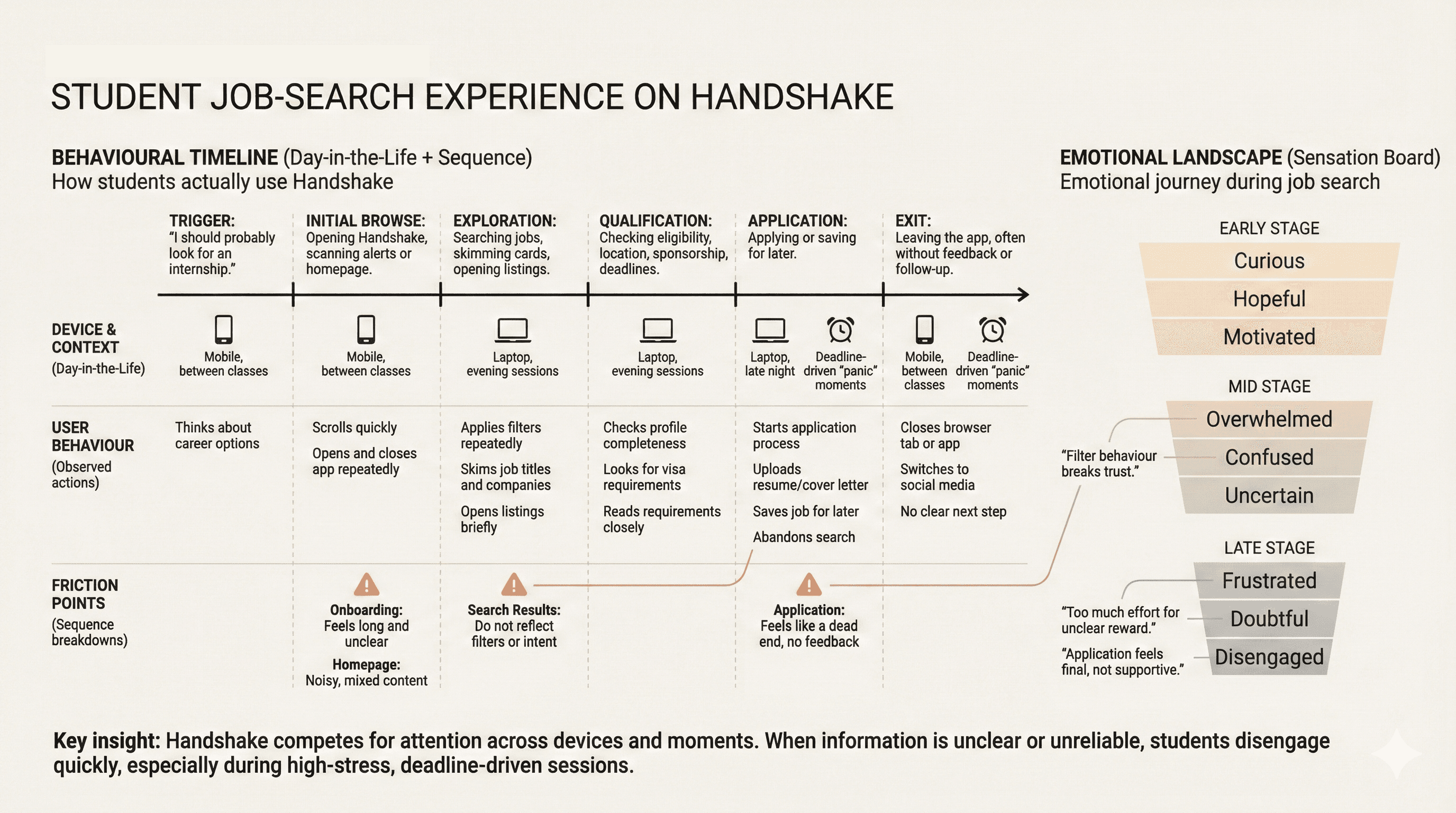 We created experience models to synthesise behavioural, contextual, and emotional data into a shared view of how students actually experience Handshake during their job search.